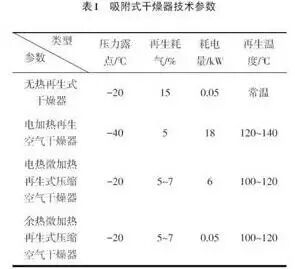 虽然吸附式干燥器运行稳定可靠,但是由于要对吸附饱和的空气进行再生,因此能耗较大,消耗空气量较大,表1所列为几种吸附式干燥器的主要技术参数。采用节能技术措施降低吸附式干燥器能耗,降低企业的生产成本,提升企业竞争力有着明显的现实意义。目前,利用空压机余热为吸附剂再生能源的技术得到广泛的使用和发展。
