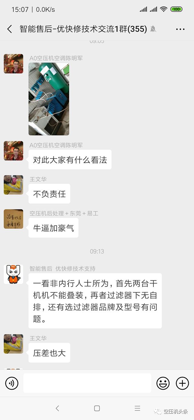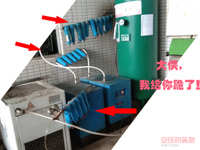 至少有以下严重错误 ▐ 摆放位置极其混乱,毫无章法 从图上看,设备摆放极其拥挤,散热和维修空间完全没有考虑到,储气罐四周留空的国家强制要求置若罔闻,管路颠来倒去,形同儿戏! ▐ 设备配置相当任性,极不专业 该用户看起来应该对气源品质要求较高,但图中的配置错误百出: ①图中应该是PPR管,这是不能被用作压缩空气主管路的; ②两台冷干机串联,自以为是叠加对除水效果有增加,实际此做法收效甚微或根本无济于事; ③被气笑的就是密密麻麻的过滤器,过滤精度相同的过滤器,哪怕布置再多,过滤精度也无法提高,正确做法应该是按照气源流程方向,配置从低到高不同过滤精度的过滤器; ④图中所有过滤器均没有自动排水装置,手阀位置也处于关闭状态,这对于管道过滤器来说是致命的,可以肯定过滤器水泡严重; ⑤如此布置,压差有多大难以想象,保守估计2~3bar,白白耗费空压机大量能耗。 ▐ 由此可能造成的后果 从图上配置推测,该成品气源品质肯定不会高。本来一台组合式干燥机,三四个过滤器就能完全满足气源品质要求的,结果弄成这种极不合理也不专业。 设备投资不少,效果却难以保障。维修保养困难繁琐,更要命的是,因为压差巨大,能耗肯定高的吓人! “花大钱还没办成事”。 如果这个用户自己配置的,只能说找“专业的人,才能做专业的事”,自己蛮干只能是“偷鸡不成蚀把米”。 如果这是其它人配置的,只能奉劝“天道好轮回,苍天饶过谁”。